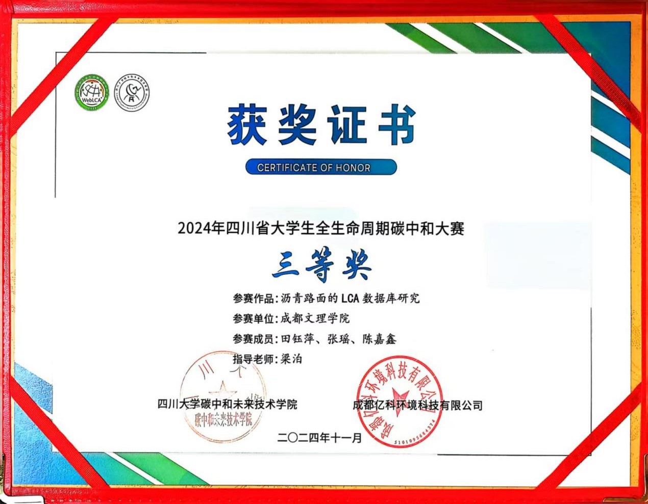 本届大赛由全国129所高校的1245人参赛,通过两个多月的模型制作和数据测算,只有117支团队建立的碳排放模型获得审核通过,经过网络视频汇报答辩,共有60个小组获奖,共发布348个产品碳足迹数据集。太阳成集团tyc714cc《沥青路面的LCA数据库研究》获得48名,建筑类第四名,团队三等奖的好成绩。