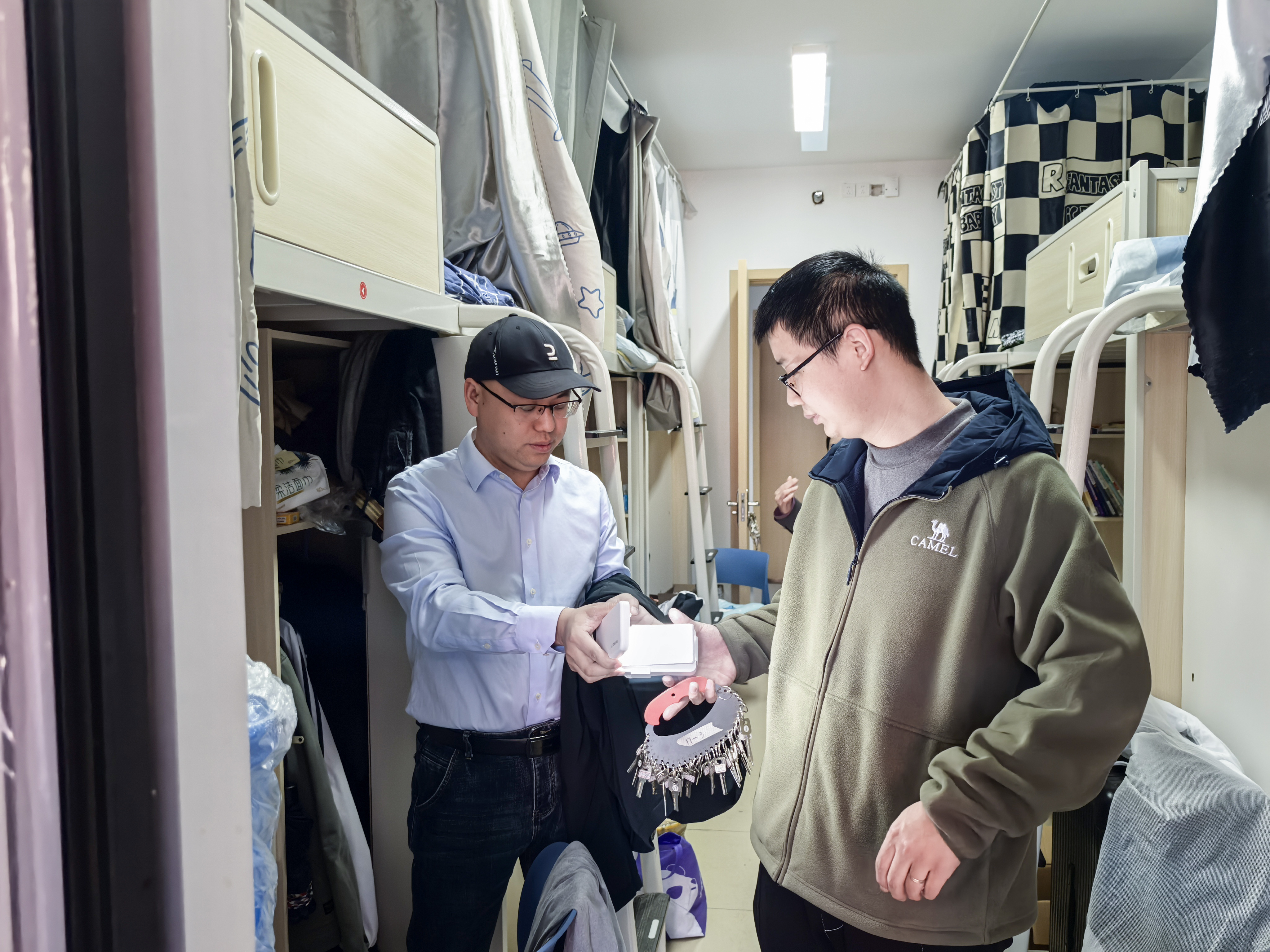 检查中逐间走访宿舍,严查违规电器、插线板上床、私拉电线等问题,现场整改并处理宿舍内的安全隐患。贺元烨强调“安全无小事,须防患于未然”。针对禁烟管理,通过询问和检查确认宿舍有无吸烟痕迹,重申集体空间健康责任。此外,结合学生反馈,严查宿舍楼内推销、代购等违规行为,警示学生远离线上线下诈骗陷阱,严禁未经批准在校内进行商业活动。