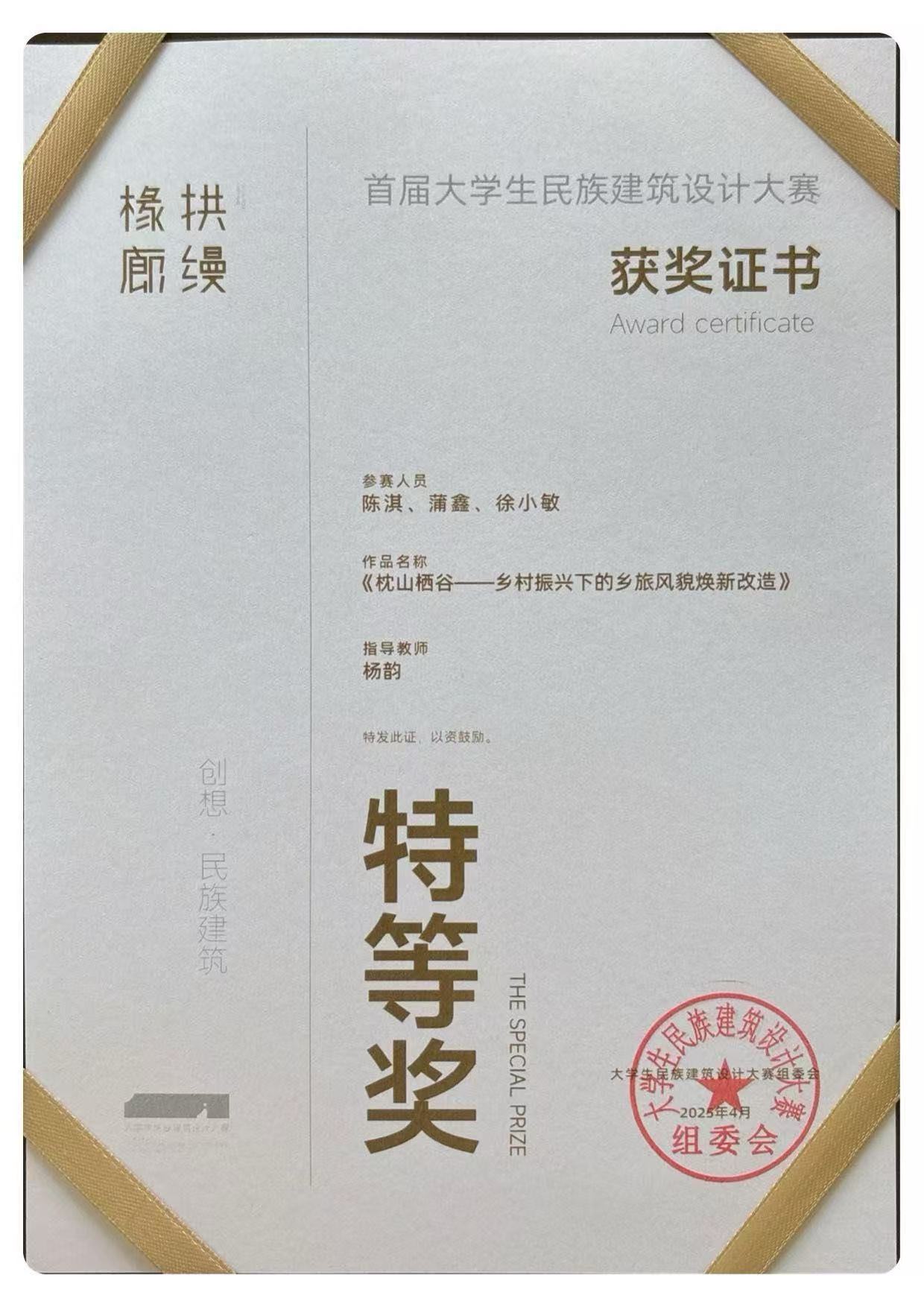 此次大赛以“椽拱·廊缦”为主题,自去年六月开赛以来,吸引了全国12个省份的近500份优秀参赛作品,展示了各高校在民族建筑设计领域的创新与实力。经过层层评选,太阳成集团tyc714cc风景园林专业蒲鑫、陈淇、徐小敏团队的作品《枕山栖谷——乡村振兴下的乡旅风貌焕新改造》脱颖而出,荣获大赛特等奖!在风景园林专业老师的悉心指导下,团队深入挖掘民族建筑文化精髓,结合现代设计手法,打造出兼具传统韵味与当代功能的乡旅改造方案。作品以“乡村振兴”为切入点,巧妙融合地域特色与生态理念,展现了扎实的专业功底与创新思维,赢得了评委的高度认可。