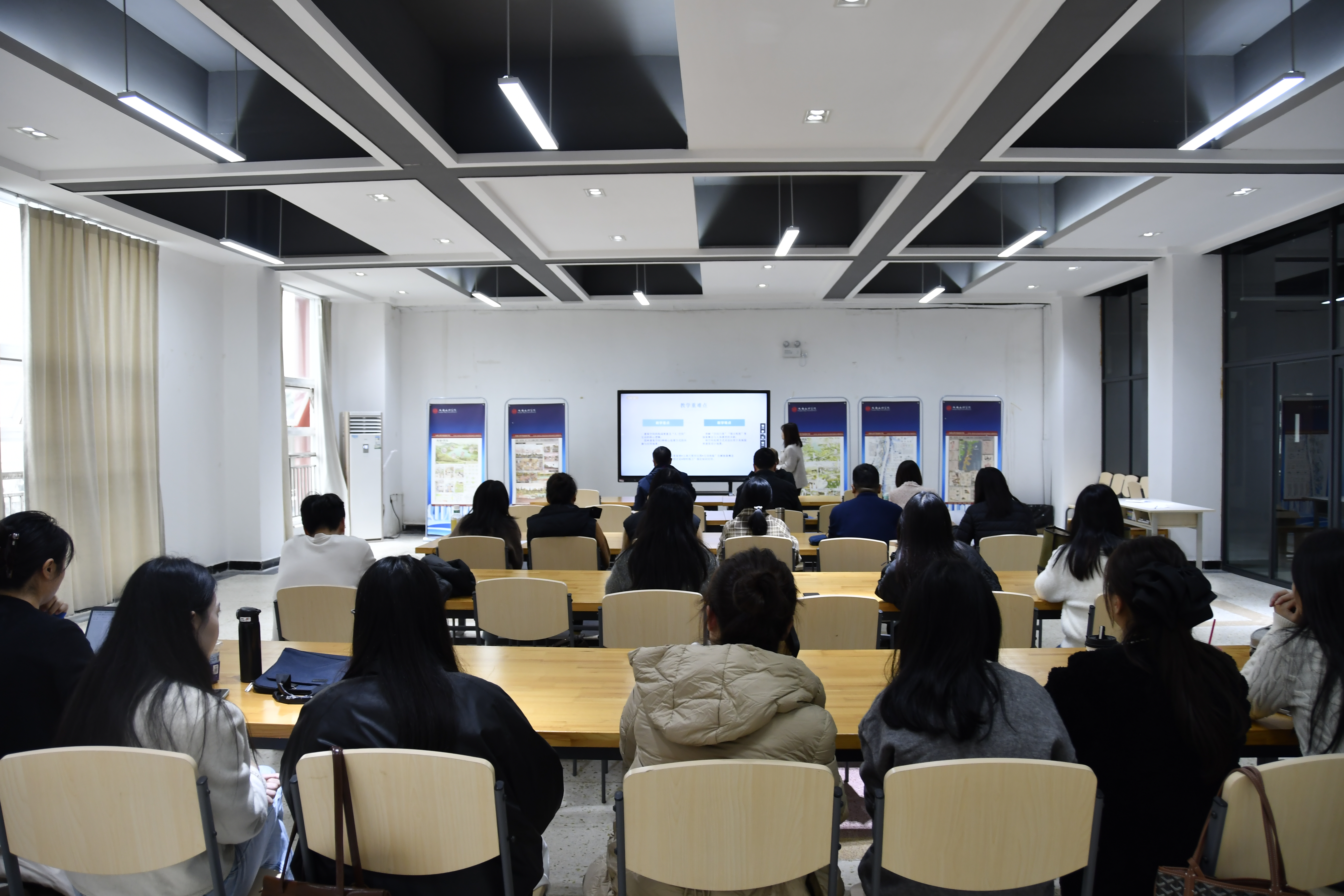 活动伊始,三位主讲教师依次进行了课程汇报。风景园林教研室何爽老师首先分享了《建筑空间》的教学设计,与会教师就如何深化“人”与“空间”的互动关系案例展开了热烈讨论。随后,工程造价教研室周博老师对《工程量计算规则与方法》的教学难点进行了梳理,其严谨的逻辑框架引发了在场教师对实践性课程教学方法的思考。建筑学教研室刘树博老师则以《四川传统老街现状及改造研究——淮口老街》为例,汇报了如何将地方性研究融入课堂,其独特的视角激起了关于传统文化传承与教学结合的深入交流。